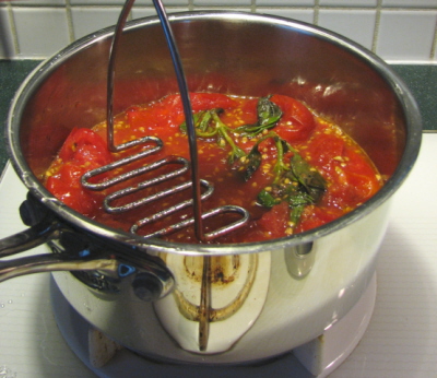 I turned on the heat and realized after a minute or so that I should have halved the tomatoes, so I hacked at them a bit with a knife and, after a few minutes more, applied a potato masher to the mix: