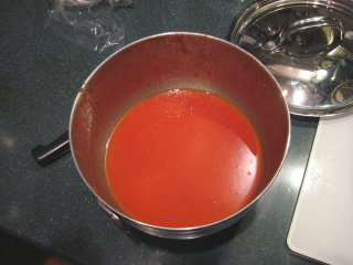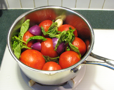 After she gave it to me on Saturday, I wanted to try it out ASAP. Being a lazy cook (at least some of the time), and having a collection of sauce-type tomatoes that needed to be used, I decided to put the chinois to the test. In super-lazy-person fashion, I put the tomatoes in a sauce pan whole along with some onion, garlic, basil, bay leaf and a spot of olive oil. I chopped nothing.