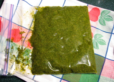 Botulism aside, those of us who (a) make large portions of pesto or (b) use small bits of it at a time need something that lasts longer than the oil-covering method. The plastic bag provides the perfect solution.