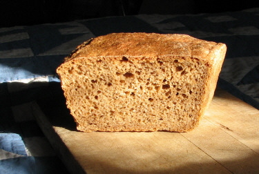 4. Heat the oven to 350 degrees. Brush the top of the loaf lightly with water, then put in the oven. Bake for about 45 minutes, or until the bottom of the loaf sounds hollow when you tap it (it will fall easily from the loaf pan) or the internal temperature reads about 210 degrees. Remove the loaf from the pan and cool on a wire rack. [Mine went about 55 minutes.] Yield: 1 loaf.